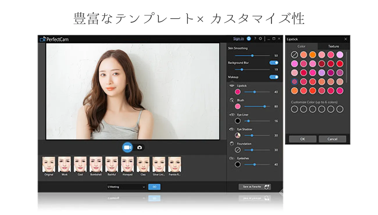 バーチャルメイクやテンプレートを利用する事で カメラアプリのフィルターをつける感覚で、美肌・簡単にメイクを施して配信をする事ができます
